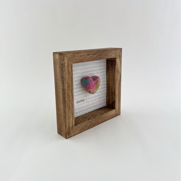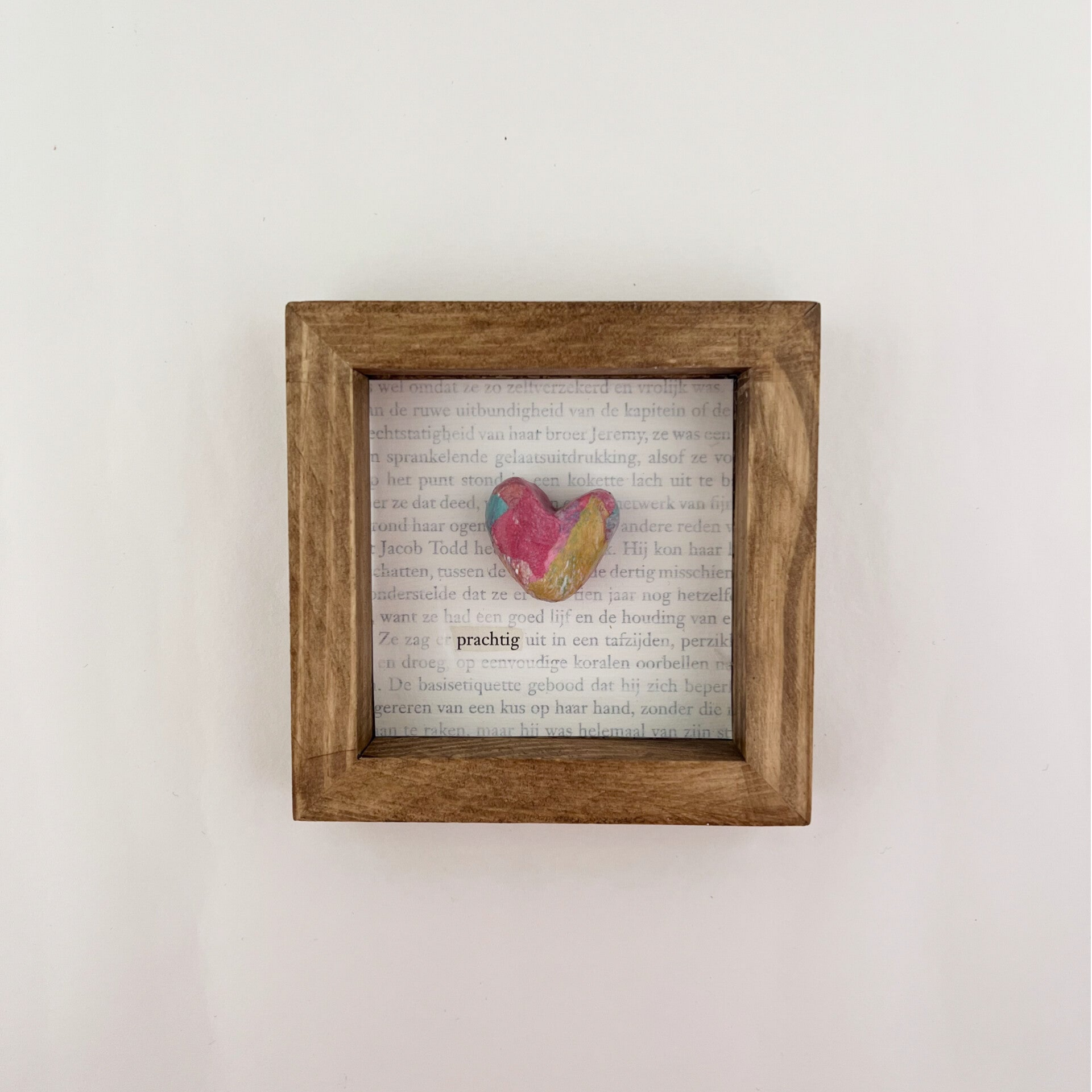 Het lijstje bevat een handgemaakt hartje op een boekpagina waar het woord Prachtig eruit springt. Een mooie reminder voor aan de muur of op een plankje.