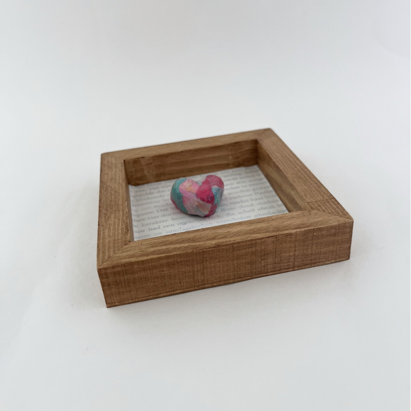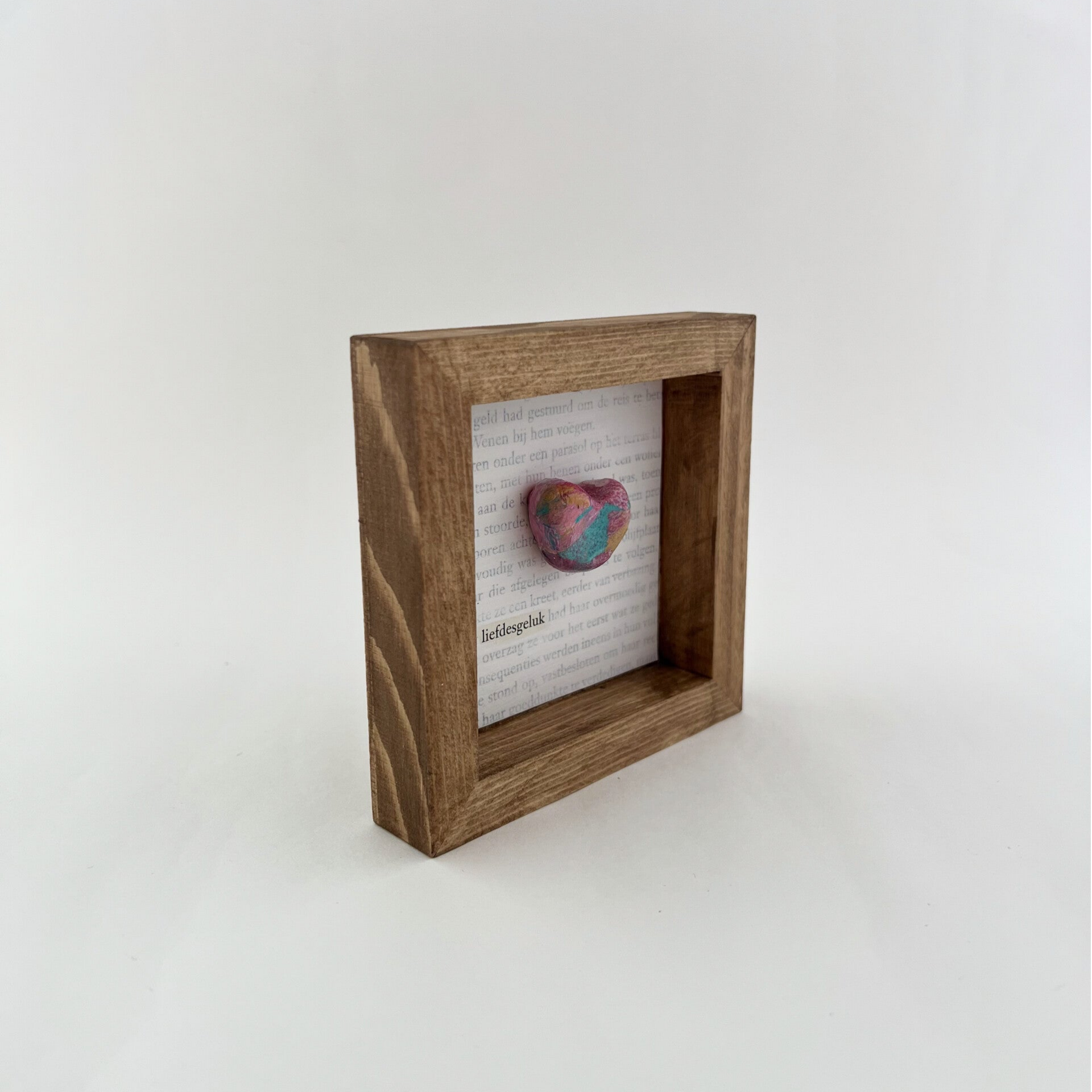 Het lijstje bevat een handgemaakt hartje op een boekpagina waar het woord Liefdesgeluk eruit springt. Een mooie reminder voor aan de muur of op een plankje.