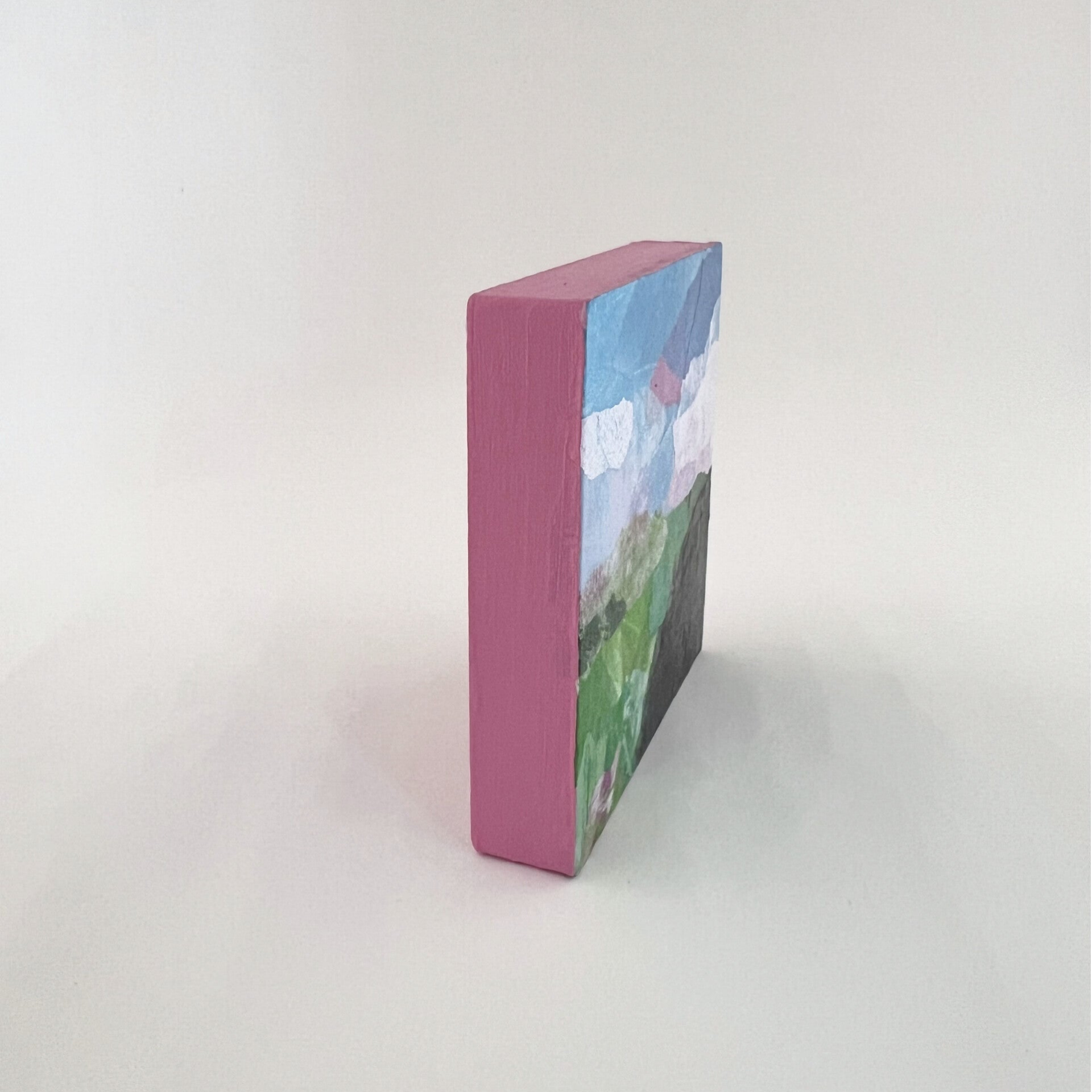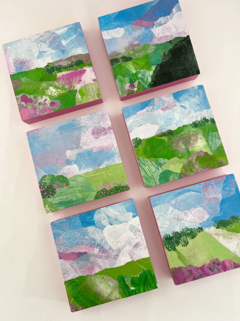 Dit mini landschap is onderdeel van een serie van 6 originele kunstwerkjes. Gemaakt met acrylverf op houten paneeltje met mijn zelfbedachte collagetechniek.