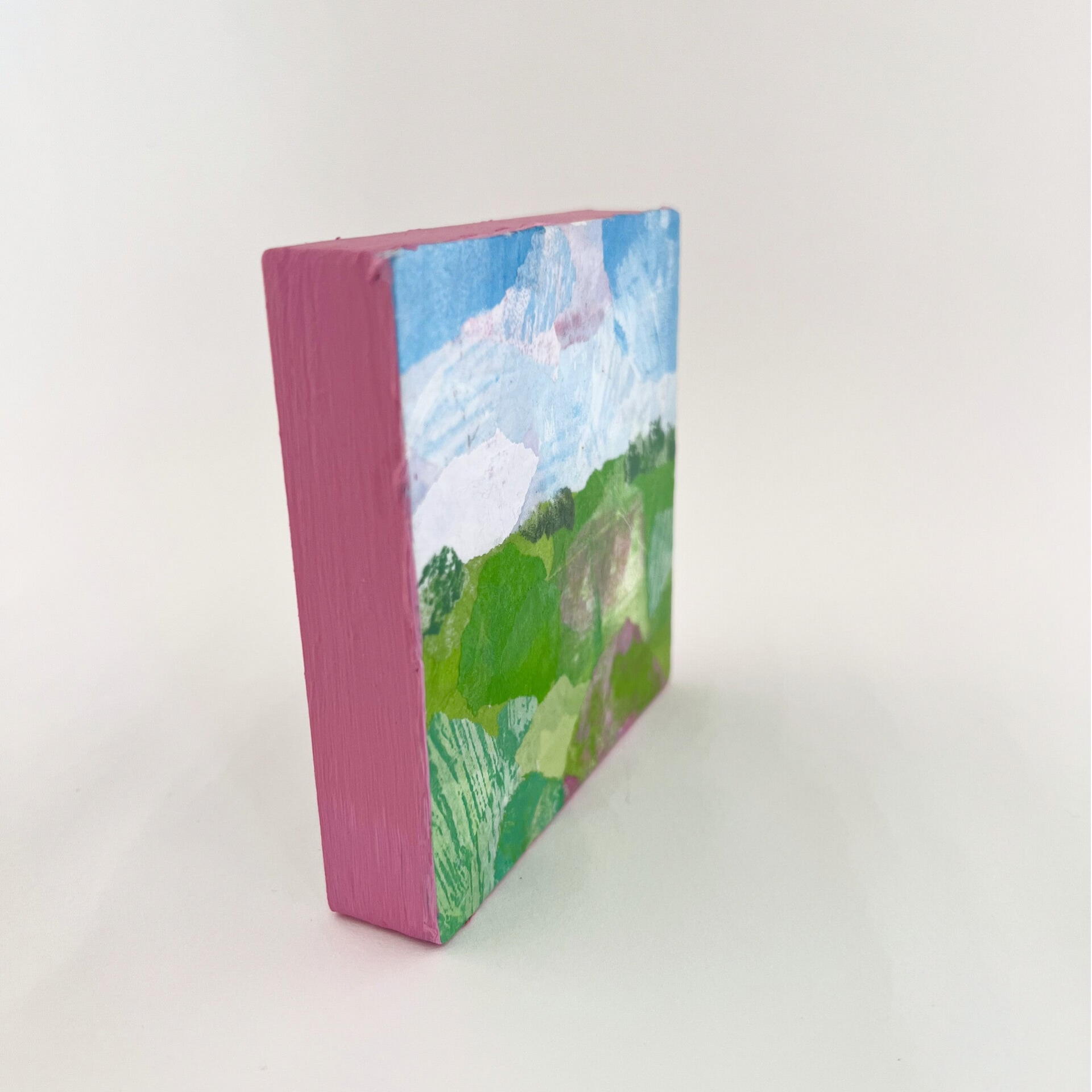 Dit mini landschap is onderdeel van een serie van 6 originele kunstwerkjes. Gemaakt met acrylverf op houten paneeltje met mijn zelfbedachte collagetechniek.