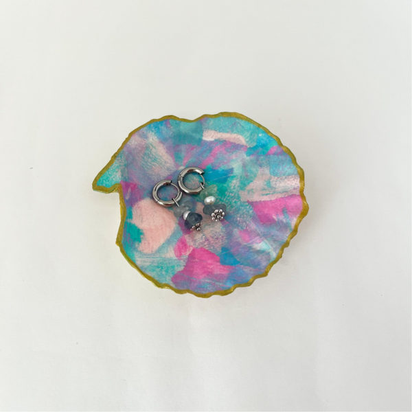 De schaaltjes zijn gemaakt van echte sint-jacobsschelpen bekleed met mijn zelfbedachte collagetechniek van tissuepapier. Ze zijn voorzien van vernislaag en gouden randje.