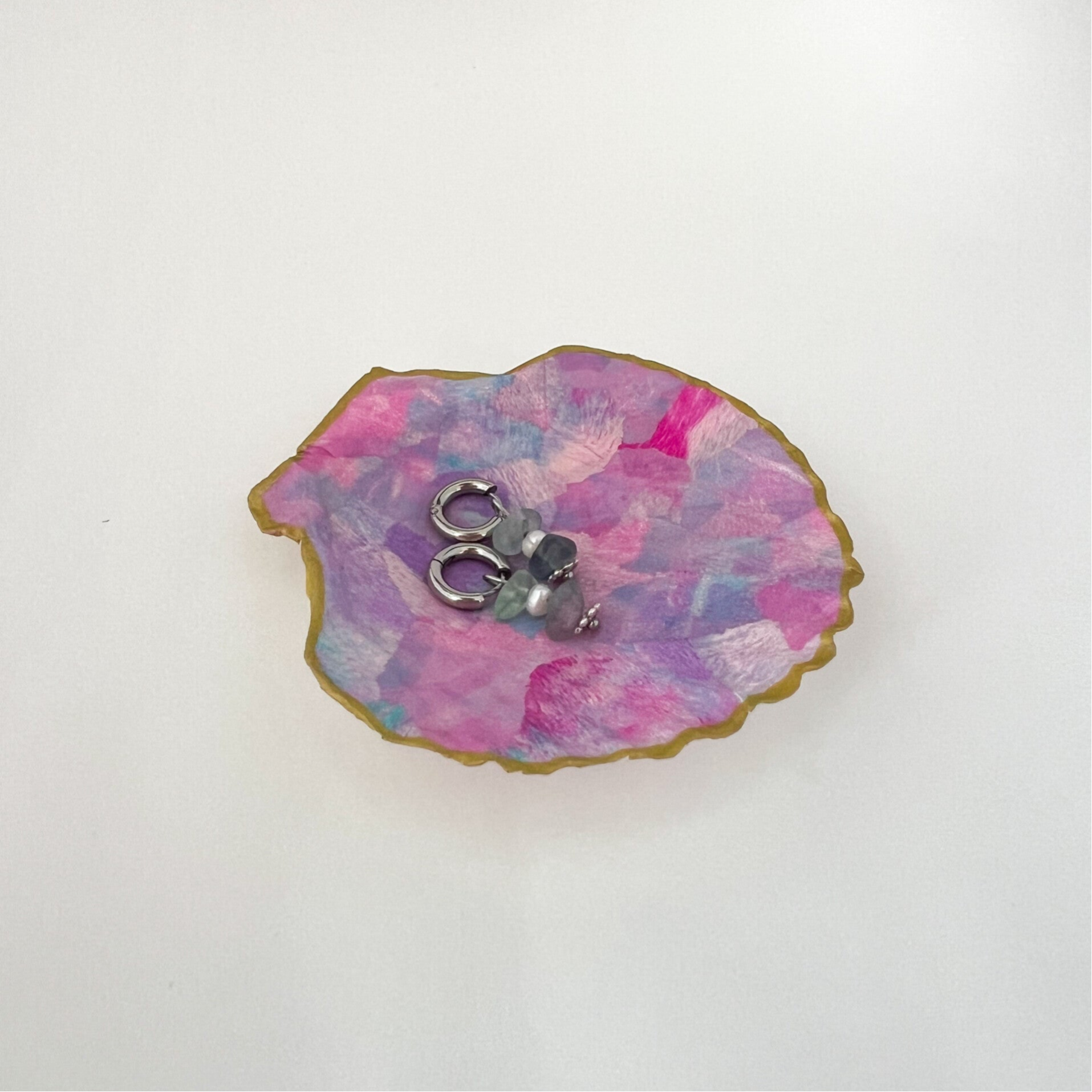 De schaaltjes zijn gemaakt van echte sint-jacobsschelpen bekleed met mijn zelfbedachte collagetechniek van tissuepapier. Ze zijn voorzien van vernislaag en gouden randje.
