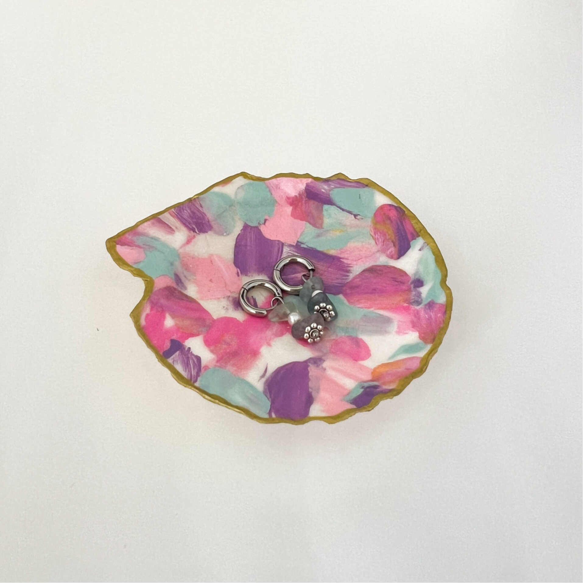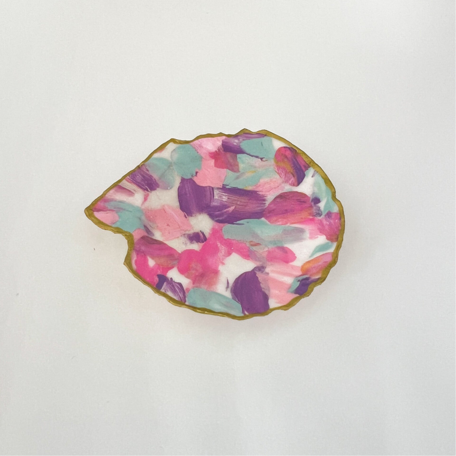 De schaaltjes zijn gemaakt van echte sint-jacobsschelpen bekleed met mijn zelfbedachte collagetechniek van tissuepapier. Ze zijn voorzien van vernislaag en gouden randje.