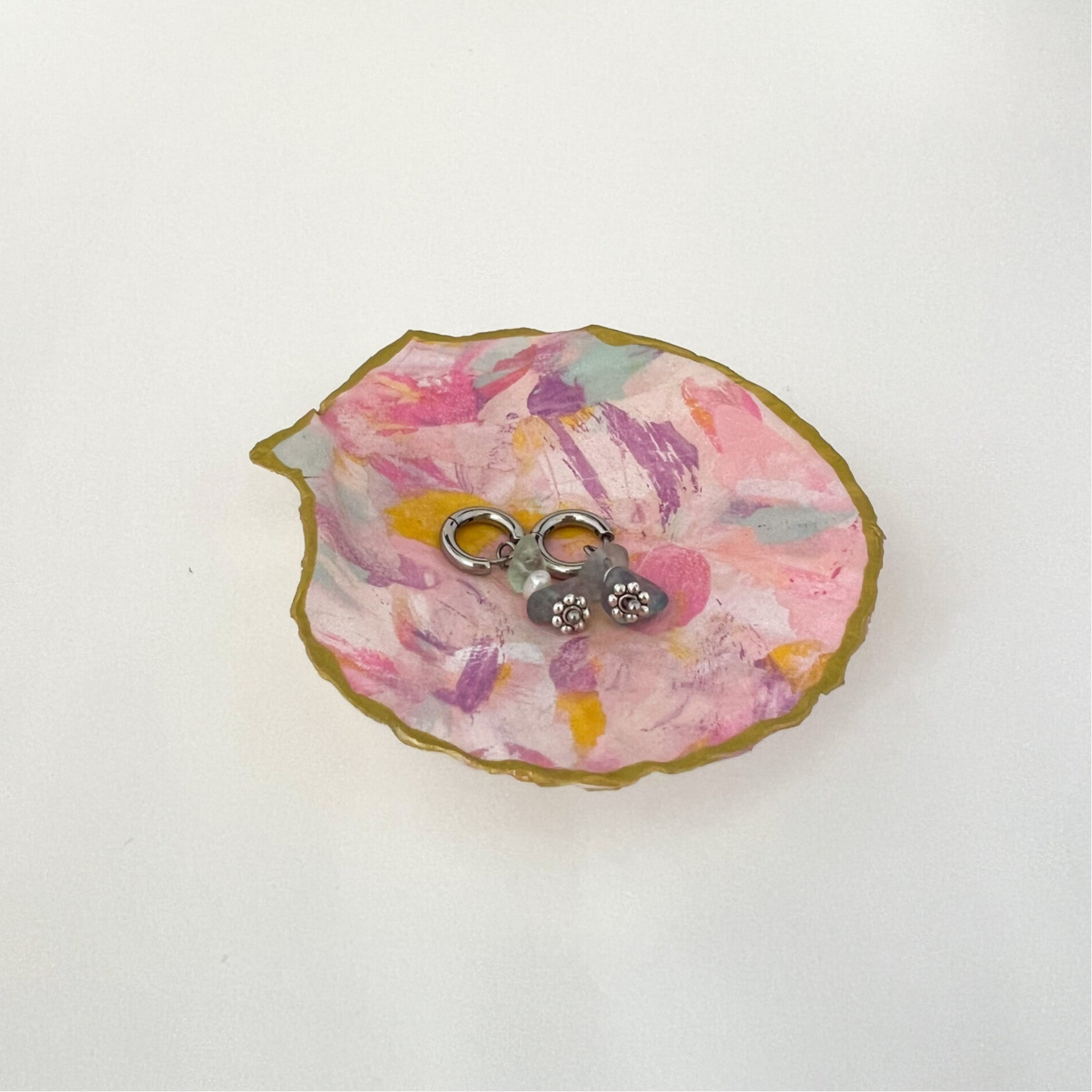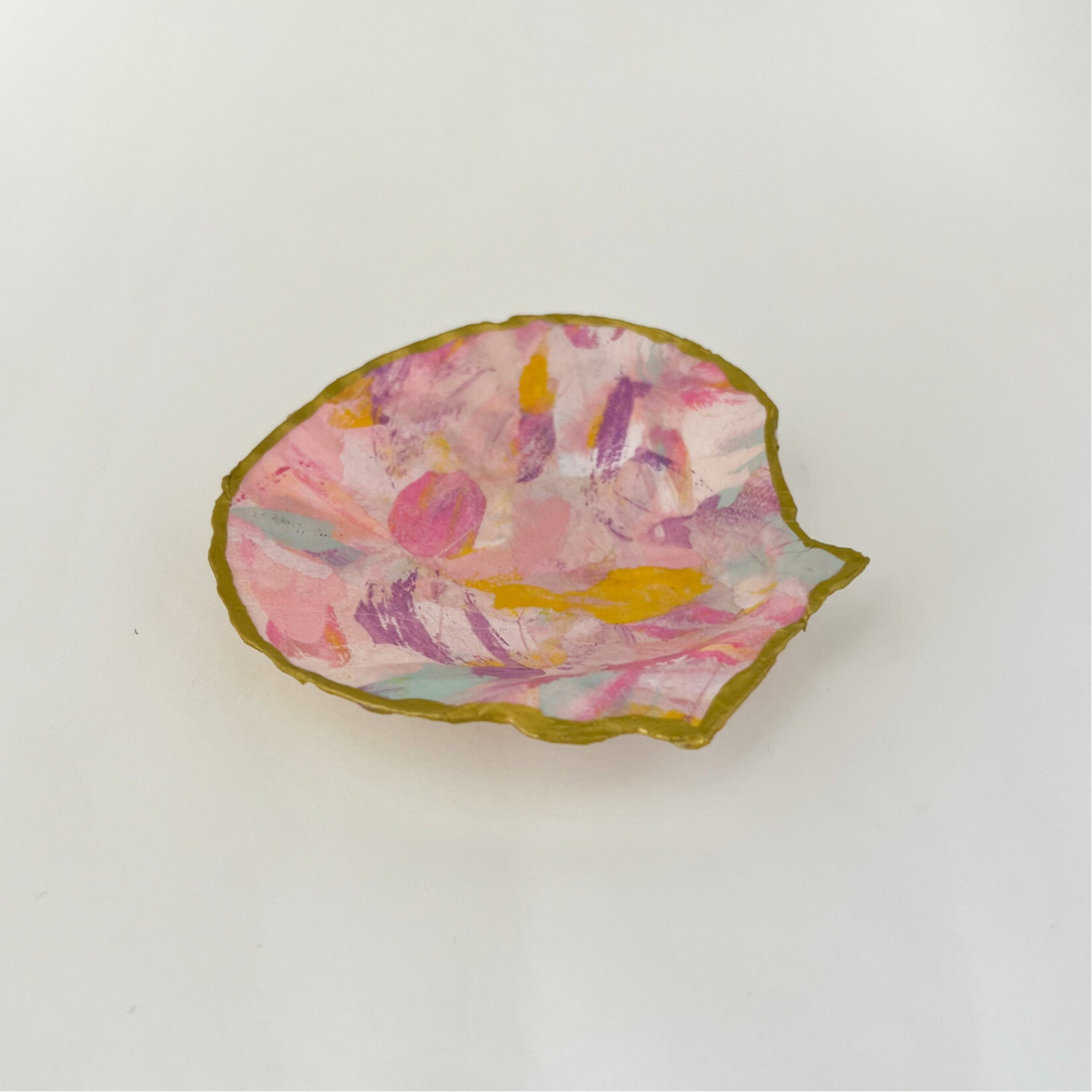 De schaaltjes zijn gemaakt van echte sint-jacobsschelpen bekleed met mijn zelfbedachte collagetechniek van tissuepapier. Ze zijn voorzien van vernislaag en gouden randje.