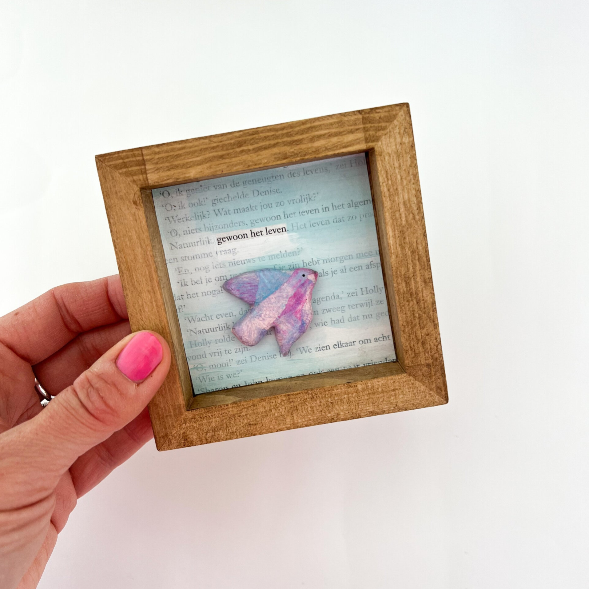 Het lijstje bevat een handgemaakt vogeltje op een boekpagina waar de zin 'Gewoon het leven' eruit springt. Een mooie reminder voor aan de muur of op een plankje.