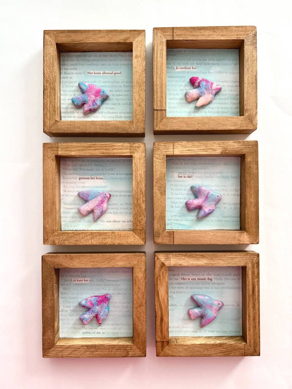 Het lijstje bevat een handgemaakt vogeltje op een boekpagina waar de zin 'Het komt allemaal goed' eruit springt. Een mooie reminder voor aan de muur of op een plankje.